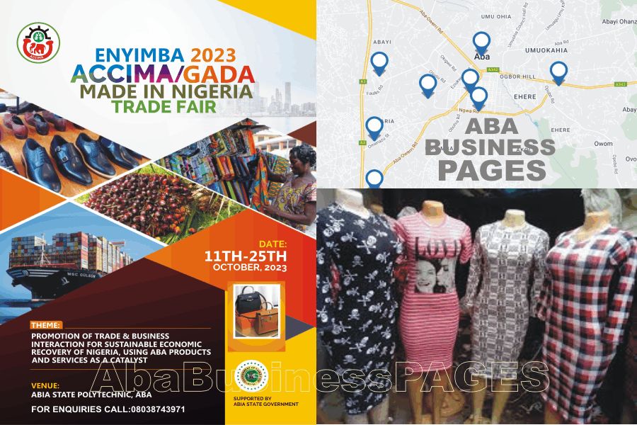 The Aba Chamber of Commerce Industry Mines and Agriculture (ACCIMA) in collaboration with Abia State Ministry of Small and Medium Enterprises (SME) and the Ministry of Trade, Commerce and Industry, is organizing a 2 weeks Made-in-Nigeria Trade Fair in Aba, codenamed "Enyimba 2023". "Enyimba 2023" is supported by the Abia State Government.